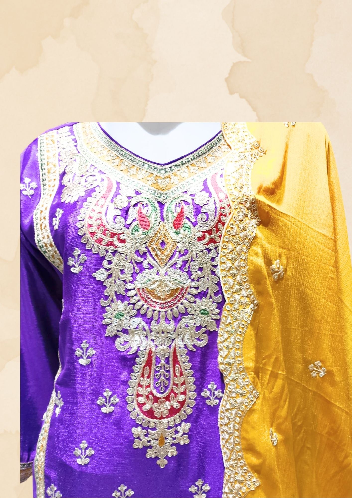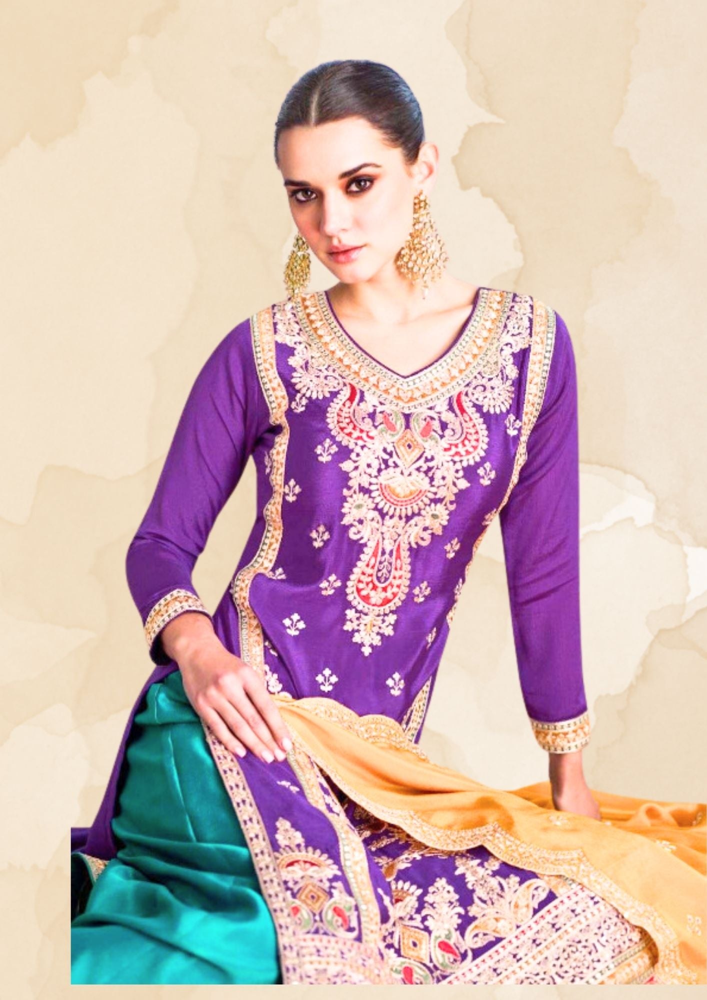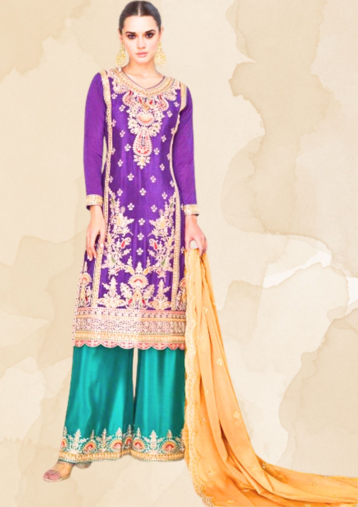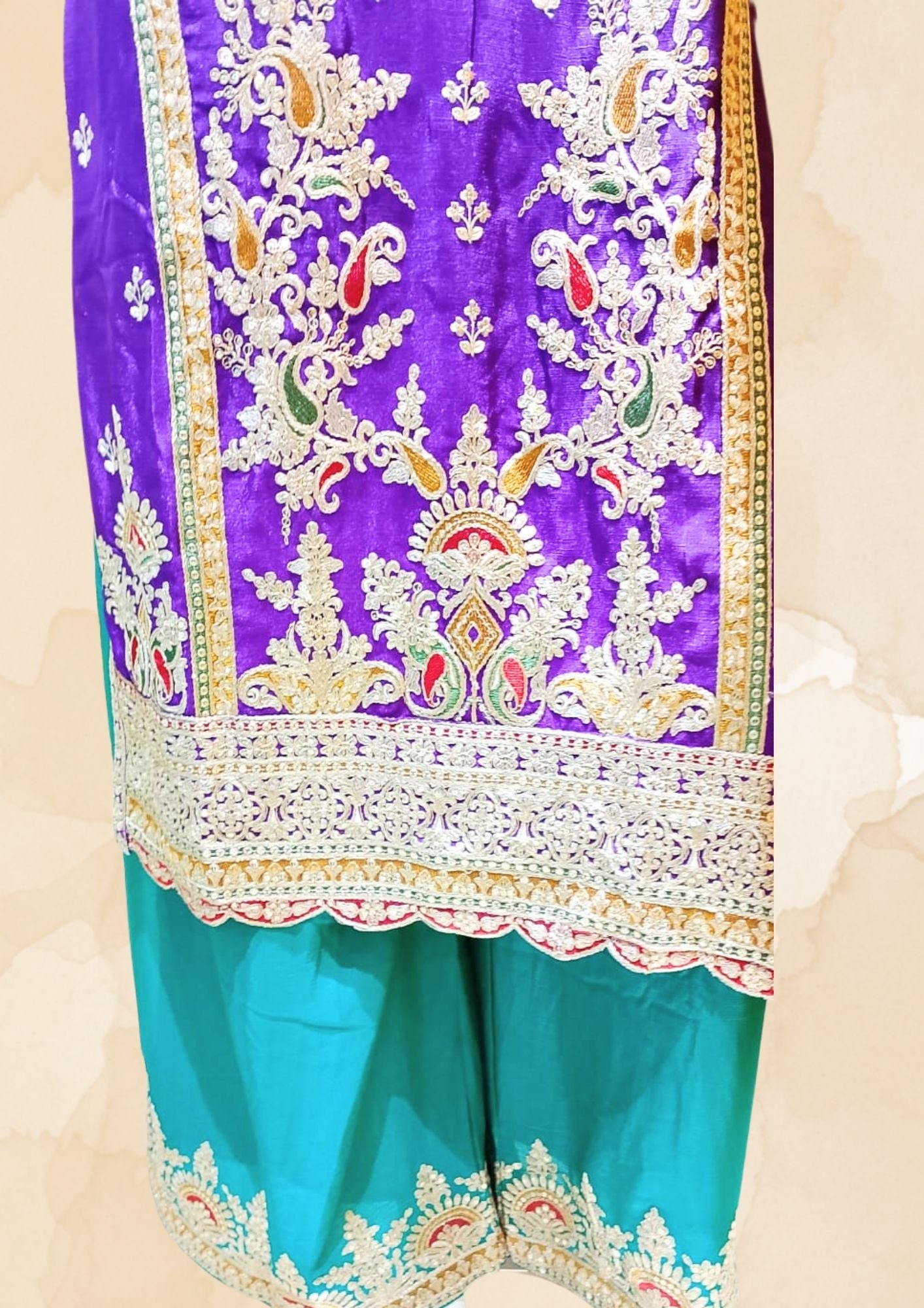 · Elegant Design: This stunning red kurta and purple sharara dress features intricate floral embroidery with golden accents for a regal, ethnic look.