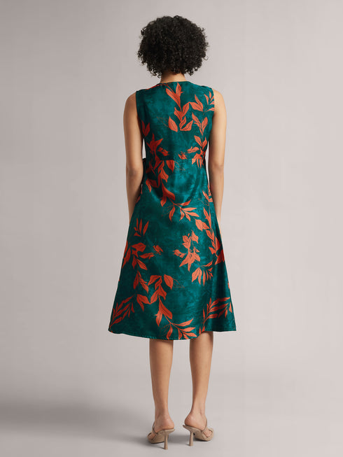 - Zaccai Women's Teal Organza Floral Dress. This woven ensemble features a rich teal hue with a dark green floral print on luxurious organza. The dress boasts a V-neck, sleeveless design, and a calf-length silhouette. The button closure and tie-up detail add versatility for casual or evening wear. Adorned with a plain weave, digital print, and floral motif, it's a visual masterpiece that exudes modern charm.