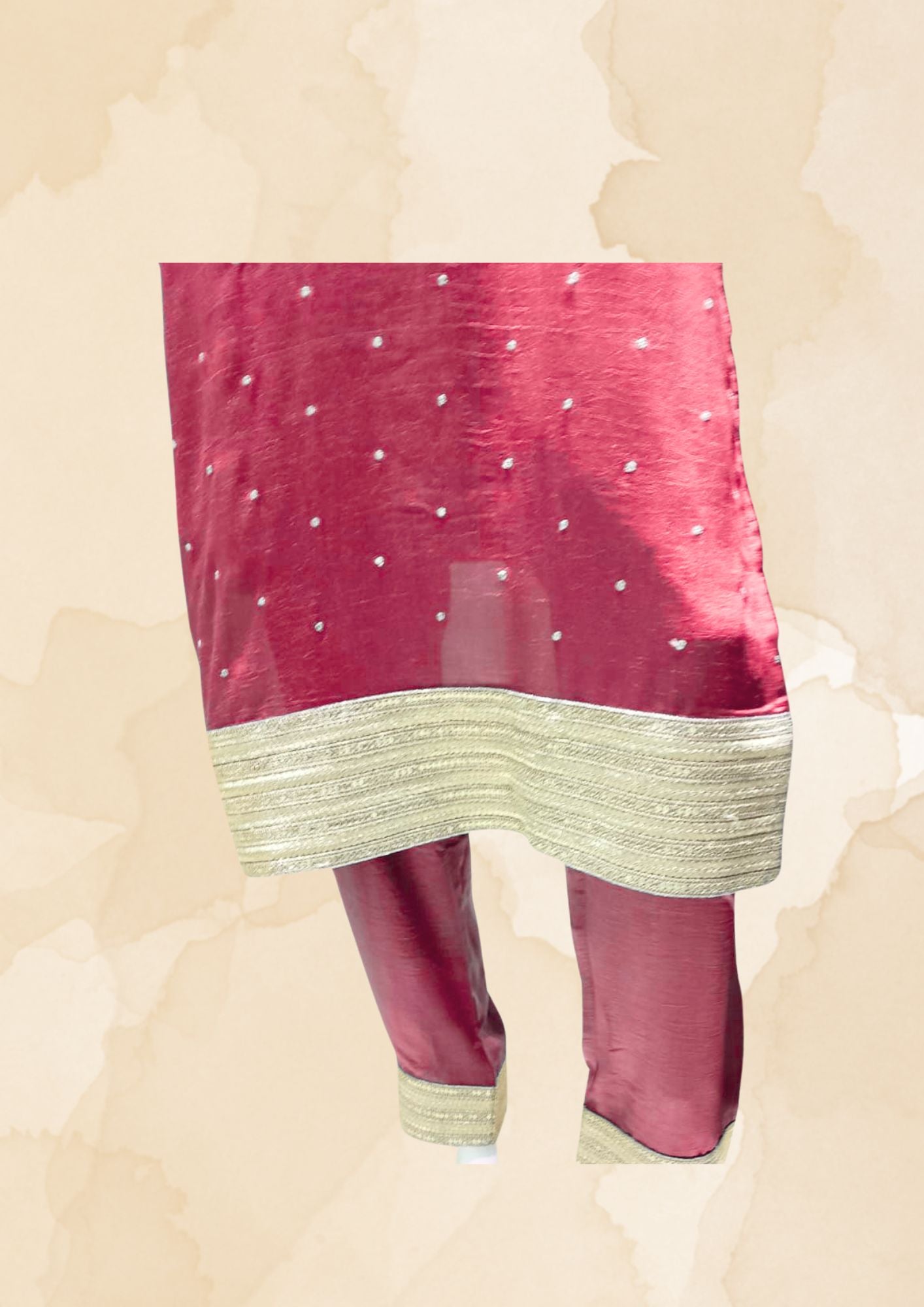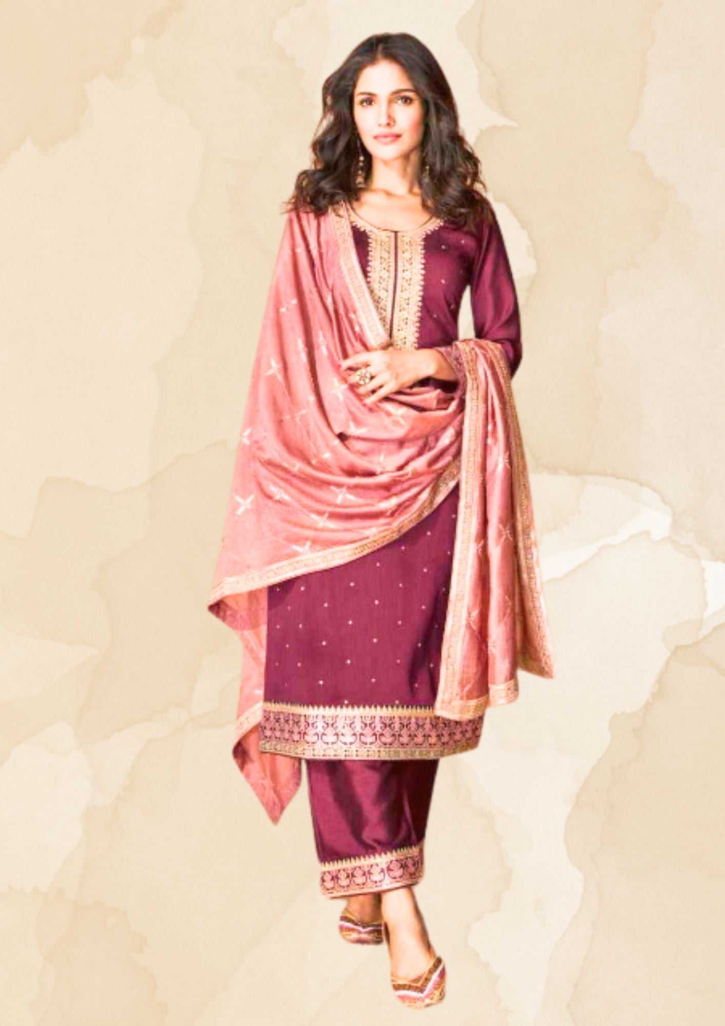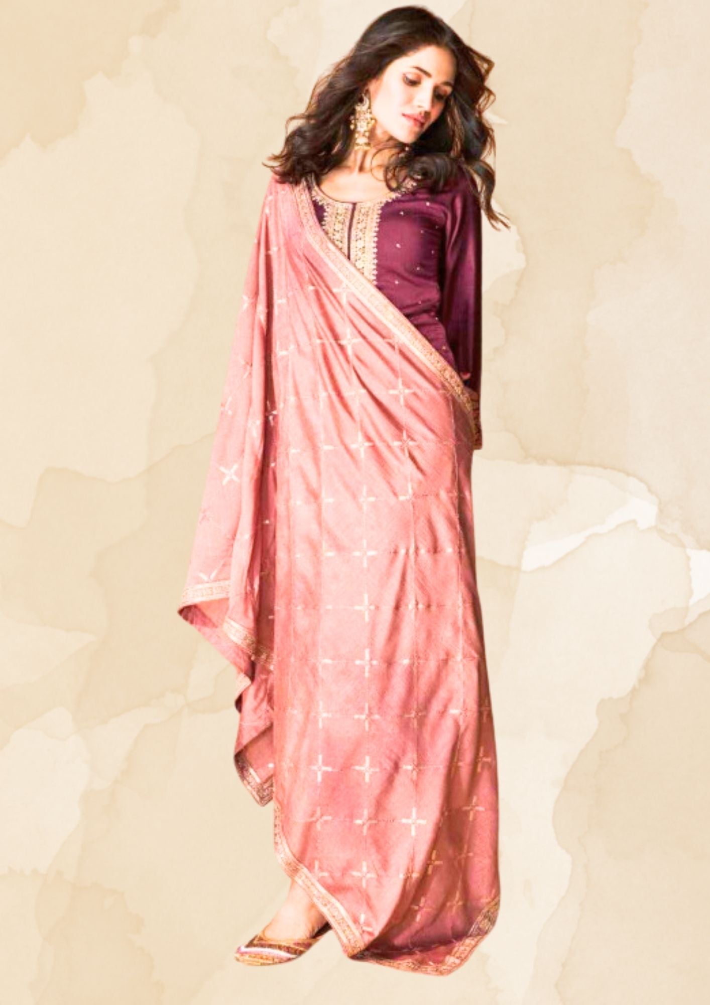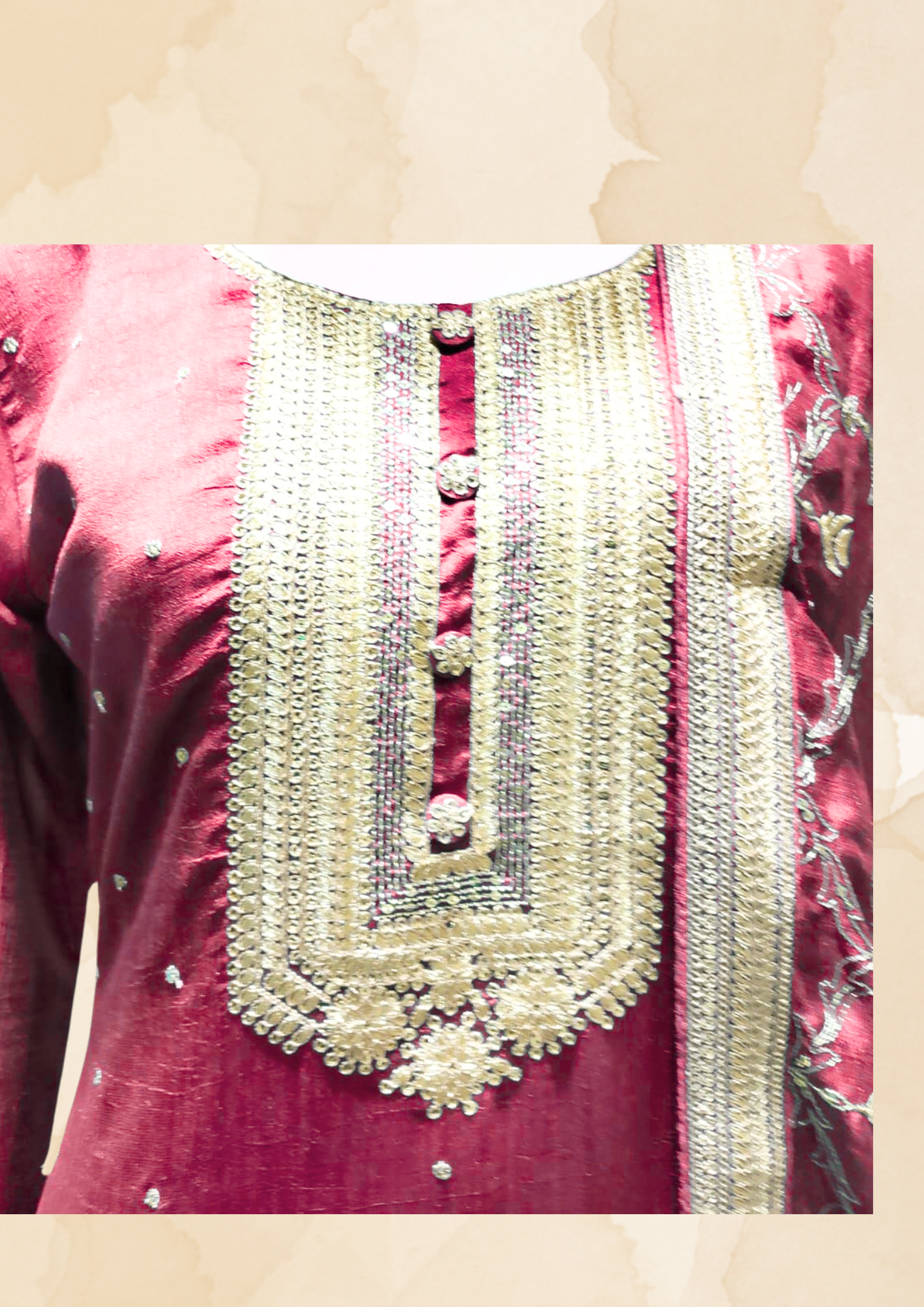 - Elegant Design: This stunning Maroon A Line suit features a delicately embroidered Kurta and a beautiful palazzo adorned with intricate floral motifs.